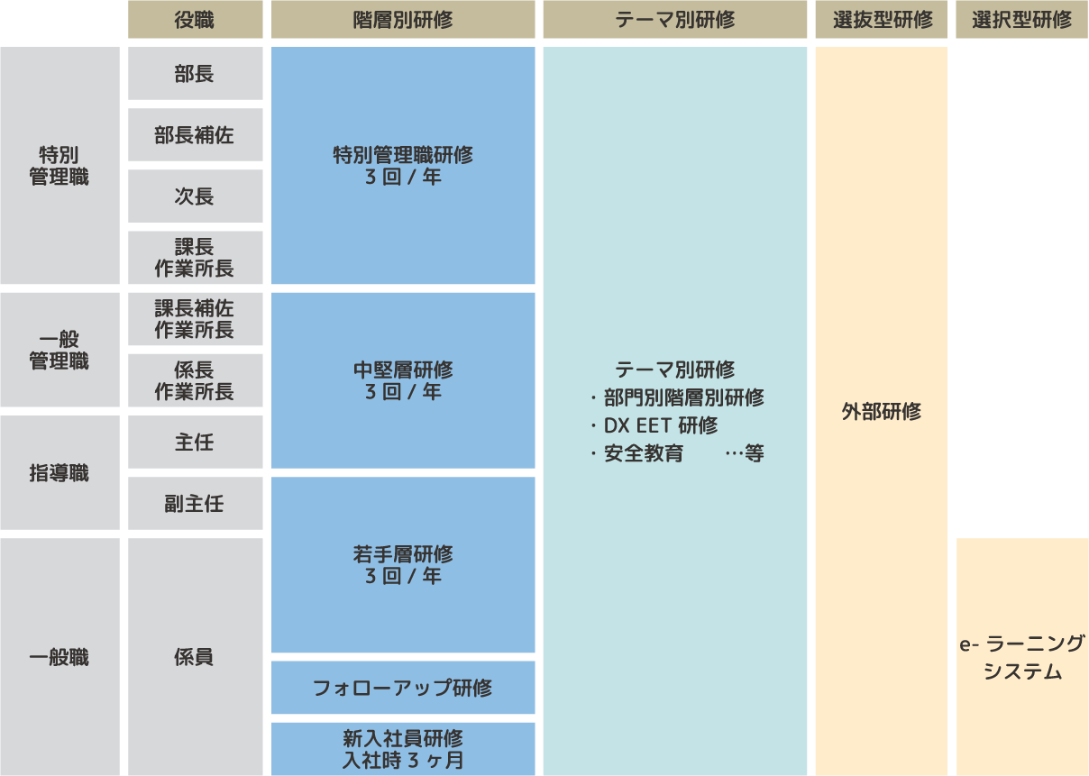 若手層や中堅・チームリーダー層、管理職層などの階層毎に分けて現状の立ち位置の確認や求められているスキルについて年3 回の研修を通じて学びます。部署の垣根を越えて近い立場の社員が集まる事で、自身の課題解決のヒントを得る事もできます。